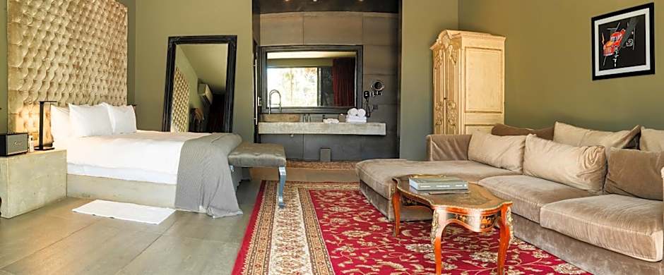 A double-level suite surrounded by labyrinth and torpical garden view. All 4 suites have living room and bed room with a unique decoration and furniture mixing classic and contemporary style with exclusive vintage pieces. The suites has king size beds and are lined with fine organic sheets, bathrooms with two types of shower and amenities.